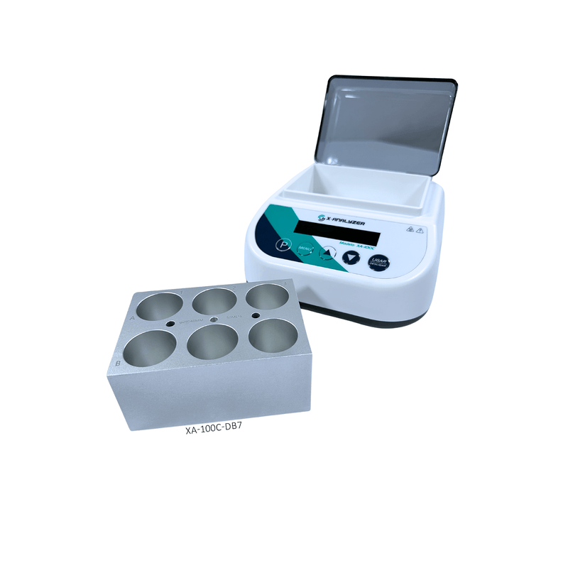 - R: O XA-100C-DB7 é compatível com módulos de alumínio intercambiáveis que suportam tubos de diversos tamanhos, desde 0,2 ml até 50 ml, além de placas de fundo plano e cubetas. Os módulos podem ser personalizados conforme necessário.